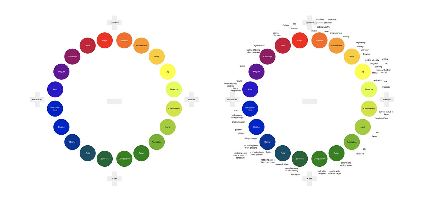 You will see that different types of emotions are spread around the circle, according to their relative strength on the two dimensions. And I have to say that I find the depiction entirely accurate in the sense that I would not want to switch any of the dots.