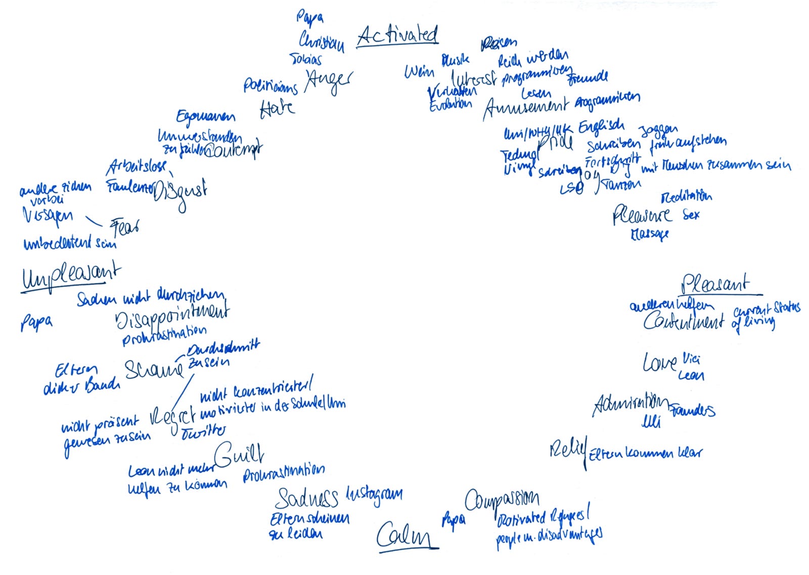 I noticed that I had instant associations for some of the emotions that seemed to fit with one of the emotions in particular. I then sat down and just brainstormed everything that came to my mind; whether an activity or object, I mapped it to wherever I thought it fit the most.